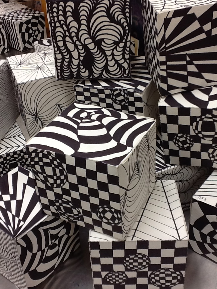 Create a three dimensional cube using geometric op art designs. Students will learn about optical illusions and how to create their own op art before creating 3d paper cubes with 6 op art sides. Is easier to draw this cube, rather than to describe in words how to draw it !